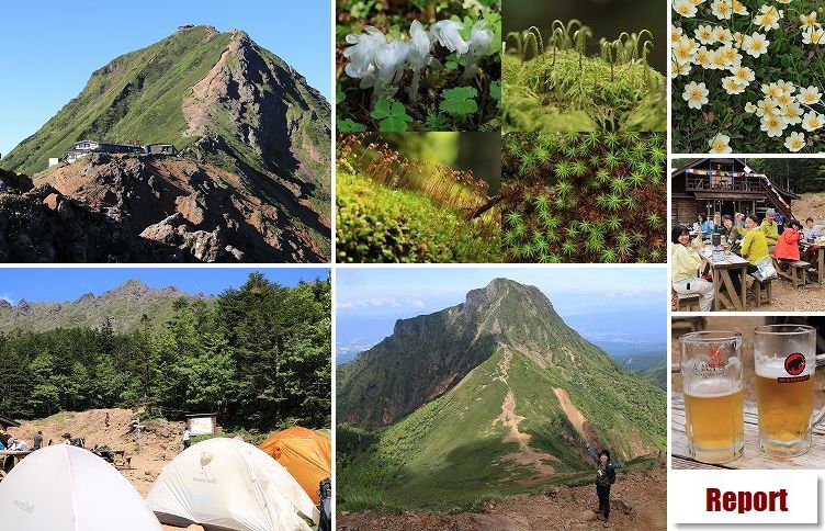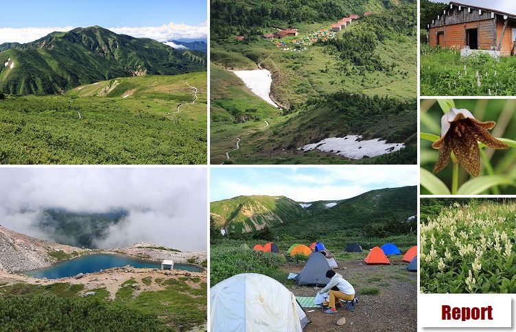 高谷池のテント場はまだ雪の上でした。 麓から登るにつれ変化する花に癒やされ、 天狗の庭では池塘に映る残雪の逆さ火打に感動。 |