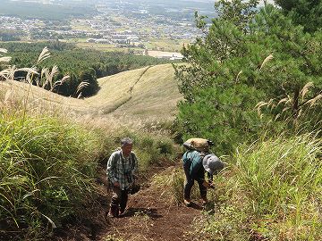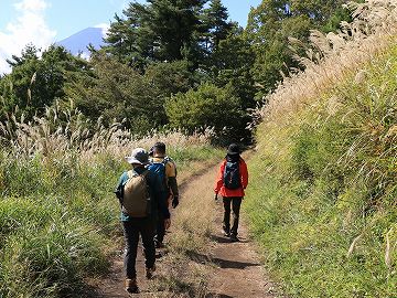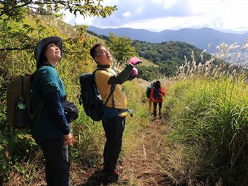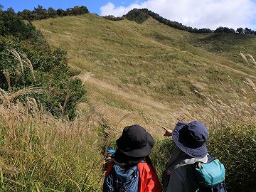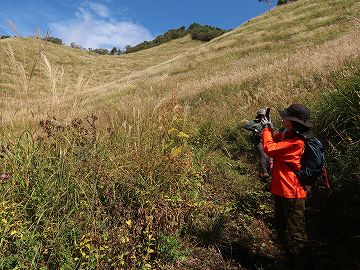 一面のススキを見上げながら林道へ向かいます